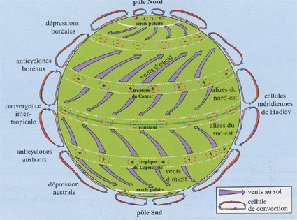 Superposons maintenant l'influence qu'exerce la rotation de la terre. Lors de son mouvement vers le sud, l'air polaire est dévié vers la gauche, provoquant des vents polaires d'est en ouest. L'air tropicale, au contraire, montant du sud vers le nord, des hautes pressions tropicales vers les basses pressions tempérées est déviée vers la droite provoquand des vents d'est en ouest. L'air des haute pression tropicales, se dirrigeant vers les basses pressions équatoriales, est dévié vers l'ouest, donnant naissance aux alizés soufflant d'est en ouest. Les mouvements sont évidament sont inversés dans l'hémisphere Nord.