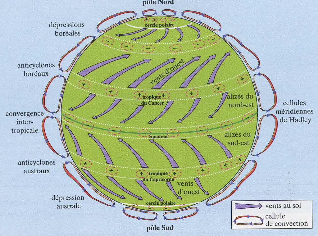 Pour conprendre les grands principes de la circulation générale, immaginons d'abord une terre qui serait uniformément recouverte par l'océan, immobile et non inclinée sur son axe. L'air froid des hautes lattitudes tends a descendre vers l'équateurs où reignent des basses pressions et où l'air chaud moins dense s'éleve en altitude. De grandes cellules de convections méridiennes s'établiraient ainsi des pôles vers l'équateurs.