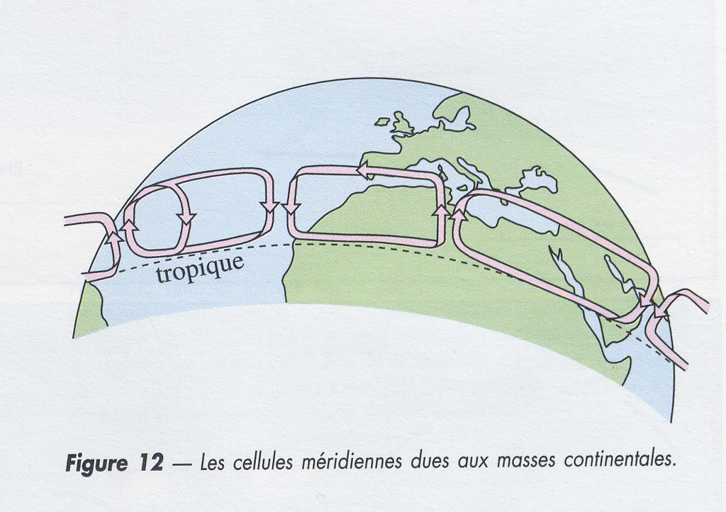 Les continents modifient la régularité de cette circulation zonale. Les masses continentales s'échauffant plus vite ou se refroidissant plus vite que les océans, la répartition des zones de haute et basse pression est perturbée.